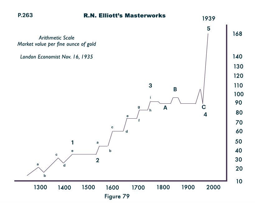 ภาพบนวาดจากจดหมายของ Ralp Nelson Elliott (เจ้าของทฤษฏี) แสดงตัวอย่างกราฟทองคำ (ปี 1300-1939) ซึ่งคลื่นย่อยของ 3 เกิน 5 คลื่น เขาก็นับไปตามความเป็นจริงของตลาดโดยไม่ตกแต่งกราฟเช่นกัน