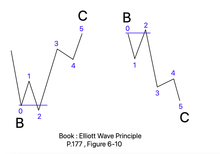 ภาพบนแสดงการนับให้คลื่น 2 ยาวกว่าคลื่น 1 (คือการที่คลื่น 2 เบรคจุด 0 แล้วเหวี่ยงกลับไปเป็นคลื่น 3 ตามภาพนั่นเอง)  เพราะถ้าไม่นับแบบนี้ก็จะทำให้คลื่นย่อยของ C มีแค่ 3 คลื่น ซึ่งผิดหลักการรหัสคลื่นย่อยที่บอกว่า C มีรหัส 5 (จึงต้องบังคับให้ C มี 5 คลื่นด้วยวิธีการใดก็ตาม) อ่านบทความ > EP1 หนังสือ Elliott Wave Principle:นับคลื่น 2 ยาวกว่า 1