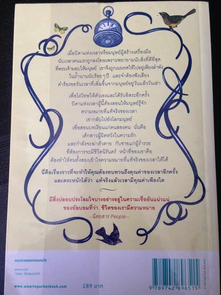 เป็นหนังสือที่สมควรมีอยู่บนโลกนี้อย่างแท้จริง ... เล่มนี้ผมซื้อมาเก็บจนลืม (น่าจะ 3-5 ปี) เพิ่งมีโอกาสอ่านจบเมื่อวาน พออ่านจบผมยกเลิกสมาชิก Netflix ยกเลิกทริปแข่งจักรยาน 2 รายการ ยกเลิกงาน Military Simulations ที่จะจัดวันอาทิตย์นี้ ยกเลิกทริปกระโดดร่มในต่างประเทศ 1 ทริปทันที ... บนโลกนี้มีคนที่ไม่ต้องการเวลาแม้วินาทีเดียว มีคนที่ต้องการเวลามากกว่าที่มีอยู่ และมีคนที่เผาผลาญเวลาไปอย่างไม่รู้คุณค่า (ผมก็คือกลุ่มหลังนี่ล่ะ) ... หนังสือเล่มนี้เป็นนิยายที่จะเปลี่ยนมุมมองและการตระหนักถึงเวลา การหวงแหนเวลา การฟุ่มเฟือยเวลา และการไม่ต้องการเวลา เราควรเป็นแบบไหน หรือไม่ควรเป็นแบบไหนเลย ตัวนิยายอิงประวัติศาสตร์นิดนึง วิทยาศาสตร์นิดนึง ศาสนาเทพปกรณัมนิดนึง และปรัชญานิดนึง ... ก่อนถึงบทสรุปเป็นอะไรที่ผมซาบซึ้งมาก ๆ “นายต้องคอยฟังเสียงฉันให้ดี ถ้าฉันพูดคำนั้นออกมา นายต้องสัญญาว่าจะทำตามหน้าที่นายอย่างเคร่งครัด” คือคำว่าอะไรก็ไปหาอ่านกันนะครับ ตอนนี้ตามร้านค้าออนไลน์น่าจะยังหาได้อยู่ครับ ... ”มีสิ่งปลอบประโลมบางอย่างอยู่ในความเชื่ออันแน่วแน่ของอัลบอมว่า ชีวิตของเรามีความหมาย”